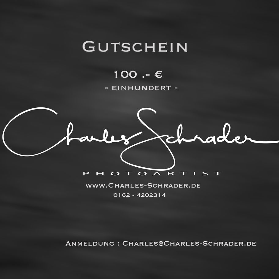 Der Gutschein 100.- € von Charles Schrader ist die perfekte Geschenkidee für alle, die sich für hochwertige Fotografie-Produkte interessieren. Mit diesem Gutschein können Sie aus dem gesamten Portfolio von Charles Schrader wählen und den Betrag ganz nach Ihren Wünschen einsetzen. Ob für Workshops, Wandbilder oder personalisierte Fotoprodukte - mit diesem Gutschein ist für jeden Fotoliebhaber das Richtige dabei. Der Gutschein ist vielseitig einsetzbar und ermöglicht es dem Beschenkten, sich selbst das perfekte Geschenk auszusuchen. Verschenken Sie mit dem Gutschein 100.- € von Charles Schrader ein Stück fotographische Leidenschaft und Inspiration.
