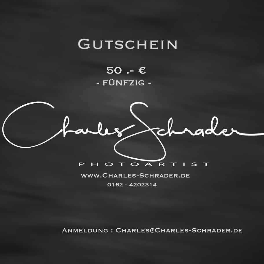 Der Gutschein 50.- € von Charles Schrader ist die perfekte Geschenkidee für alle, die sich für hochwertige Fotografie-Produkte interessieren. Mit diesem Gutschein können Sie aus dem gesamten Portfolio von Charles Schrader wählen und den Betrag ganz nach Ihren Wünschen einsetzen. Ob für Workshops, Wandbilder oder personalisierte Fotoprodukte - mit diesem Gutschein ist für jeden Fotoliebhaber das Richtige dabei. Der Gutschein ist vielseitig einsetzbar und ermöglicht es dem Beschenkten, sich selbst das perfekte Geschenk auszusuchen. Verschenken Sie mit dem Gutschein 50.- € von Charles Schrader ein Stück fotographische Leidenschaft und Inspiration.